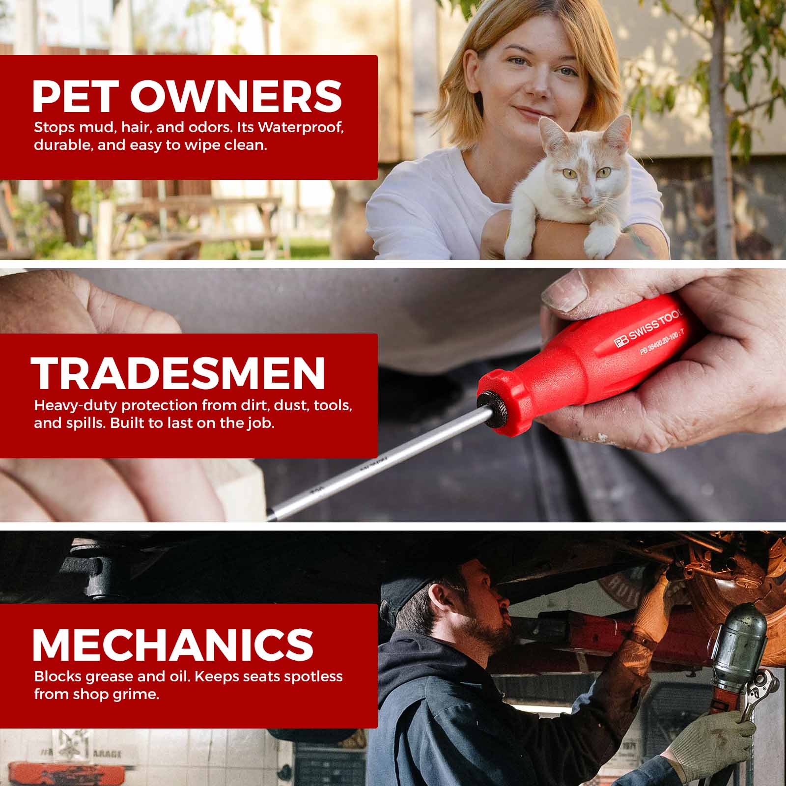 These seat covers are made from High Quality commercial nylon and are rubber backed making them waterproof and more Durable than cheaper alternatives. The easy fit seat cover set comprises of two heavy duty single seat covers which have hook & loop openings on both sides to accommodate for arm rests. One seat cover for the driver side seat and one for the passenger seat. No tools are required to fit these seat covers. The base of the seat covers is elasticised for snug fit. The covers will help protect your vehicles original seats by creating a waterproof barrier against Work Ware, Spillage, Mud, Oil, Paint, Grease, Food, and Dirt Overall. The seat covers are a smart investment which will pay off in the long run as they help to protect the resale value of your vehicle and save on valeting cost as they can simply wiped down with a damp cloth in seconds.